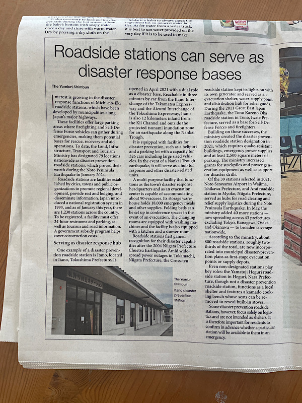 Originally built to give travelers a safe place to rest and to boost regional tourism, Michi-no-Eki now play a growing role in Japan’s disaster preparedness strategy. Their large parking lots can host Self-Defense Force vehicles, and their facilities can quickly transform into coordination points for rescue, recovery, and aid operations.